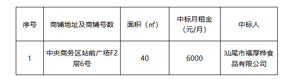 汕尾市投控工程咨詢有限公司受汕尾市投控城市運營服務集團有限公司委托于2026年3月10日10時30分,就汕尾火車站站前廣場商鋪招租項目,在汕尾市區(qū)濱湖路泰濠公寓一棟(中鑫大廈)寫字樓四層組織開標評標會議,現(xiàn)將本次公開招租結果公示如下: 如對以上結果有任何異議,請于2026年3月19日下午16:00前以書面的形式實名反映,逾期將不再受理。 地址:汕尾市城區(qū)站前橫四路市民服務廣場8樓 聯(lián)系人/聯(lián)系電話:余工 0660-3879859